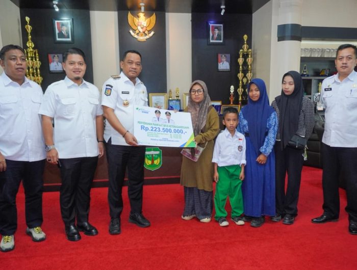 Bupati Luwu, Patahudding, menyerahkan santunan kecelakaan kerja kepada keluarga almarhum Yunus di ruang kerja Bupati Luwu, Rabu (22/4/2026). Total santunan yang diberikan mencapai Rp223.500.000 yang terdiri dari santunan kematian serta beasiswa bagi anak almarhum.